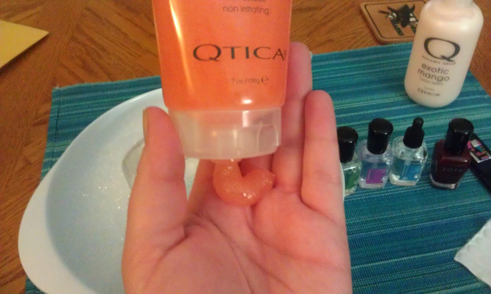 Step four: Use a good exfoliate, such as this Qtica Sugar Scrub (I have the Exotic Mango scent, which smells so good). This removes dead skin off your hands and around your nail beds! It's not a necessary step, but is luxurious and makes me feel like I am in a spa! After you are done, dunk your hands in your bowl of water to wash off the exfoliant and dead skin.